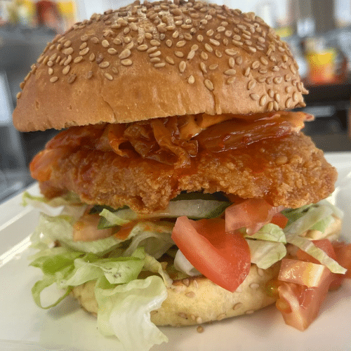 Een mais pistolet belegd met gesneden schnitzel van echte kipfilet